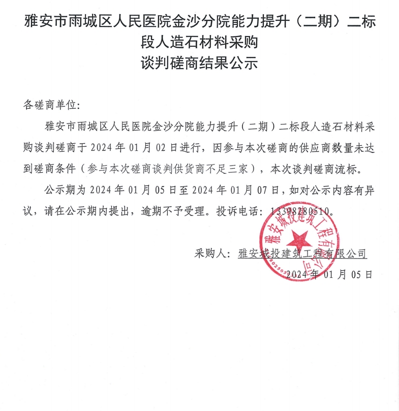 雅安市雨城區(qū)人民醫(yī)院金沙分院能力提升(二期)二標(biāo)段人造石材材料采購談判磋商結(jié)果公示
