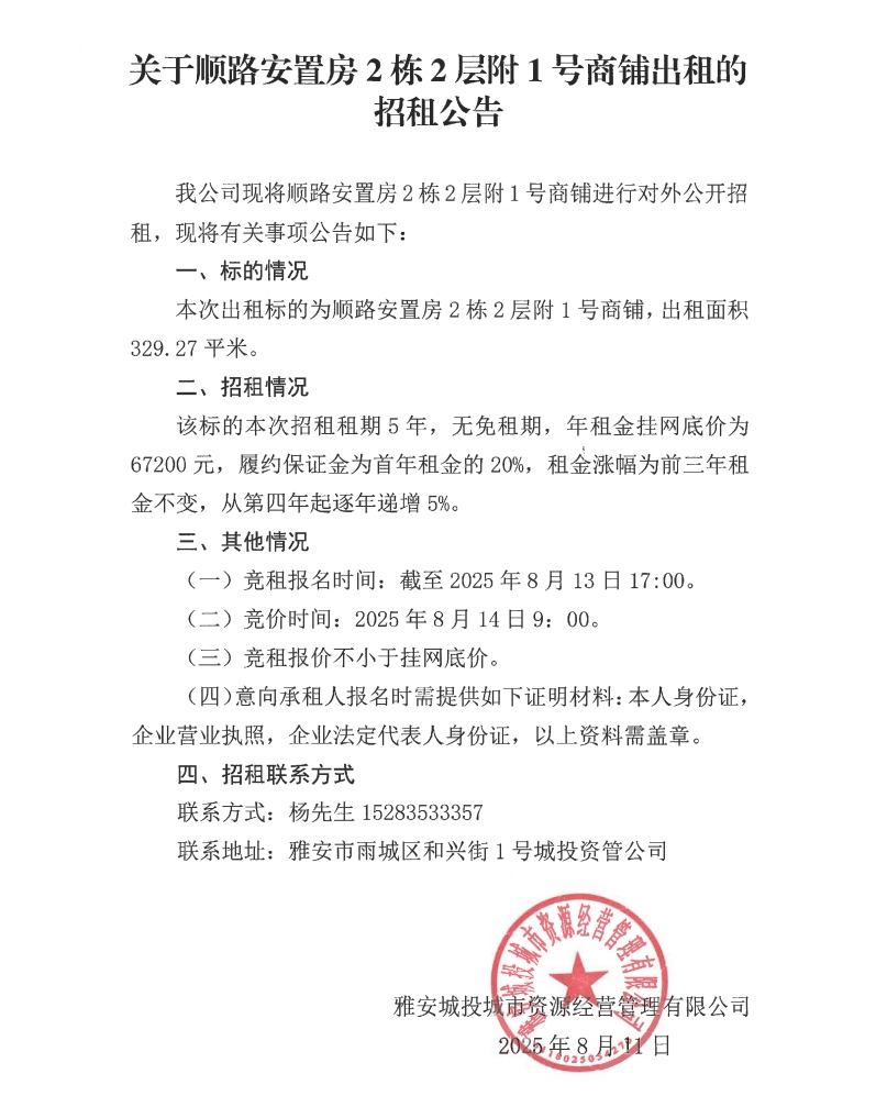 關(guān)于順路安置房2棟2層附1號商鋪出租的招租公告